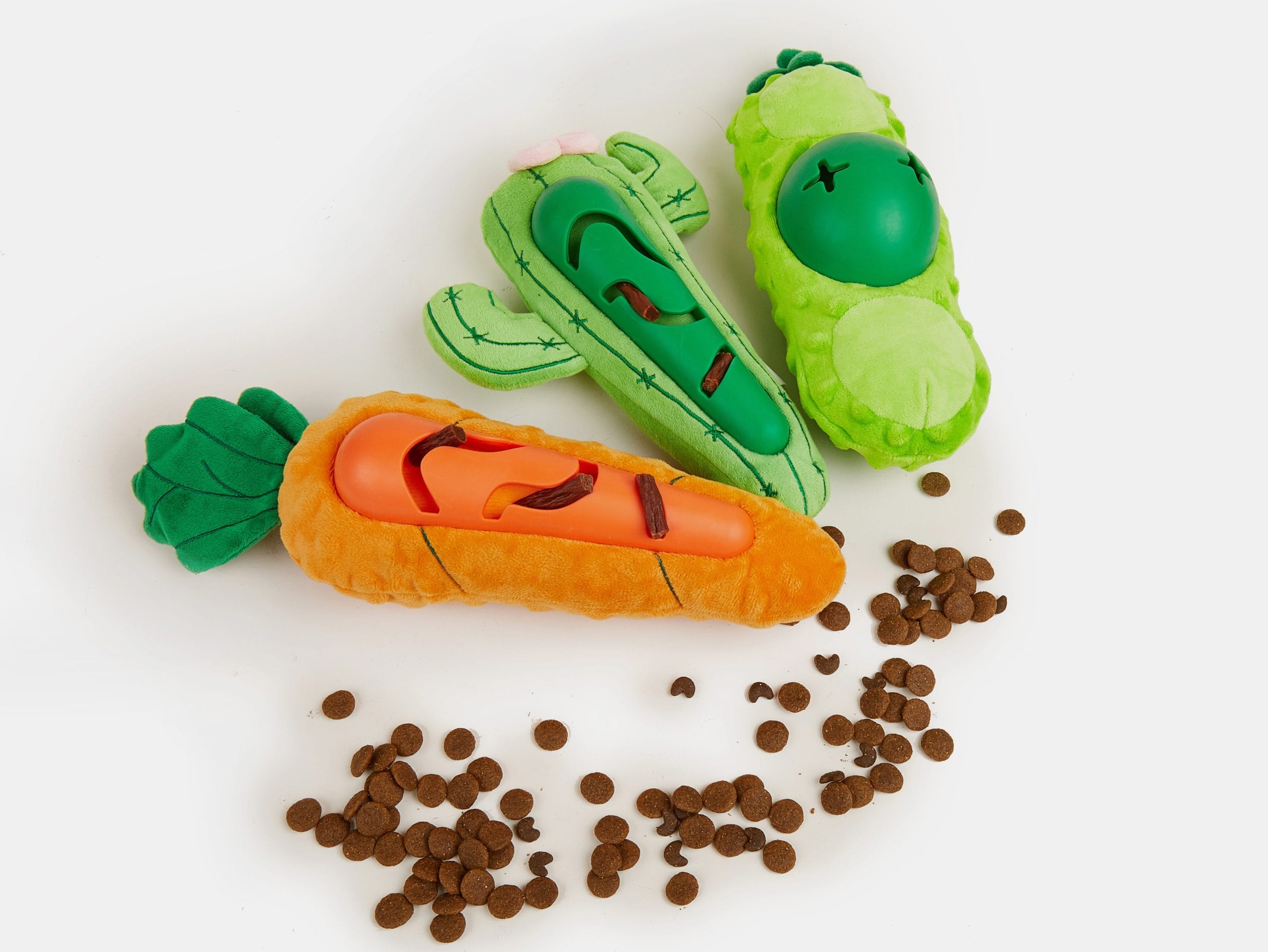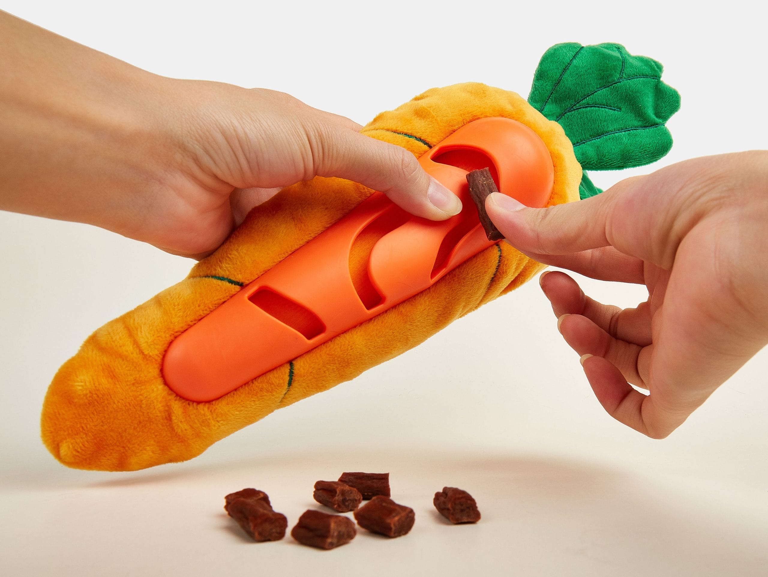 Divertido juguete interactivo en forma de zanahoria que estimula la mente de tu perro. Puedes esconder premios en su interior para mantenerlo entretenido, reducir el estrés y reforzar el juego inteligente.